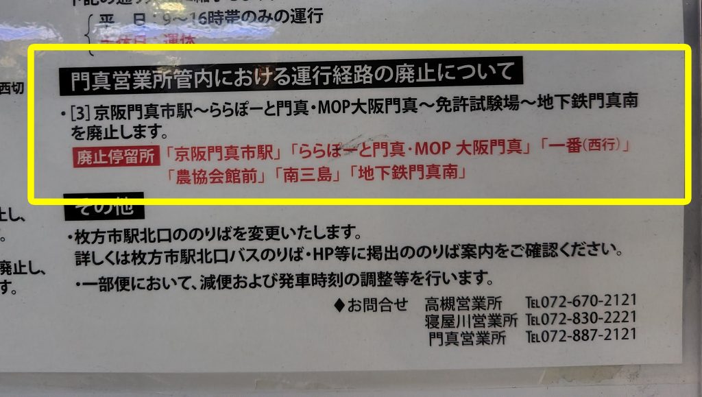 今まで「門真南駅」から「ららぽーと門真・三井アウトレットパーク大阪門真」まで直行できた京阪バスの路線が廃止されていました。